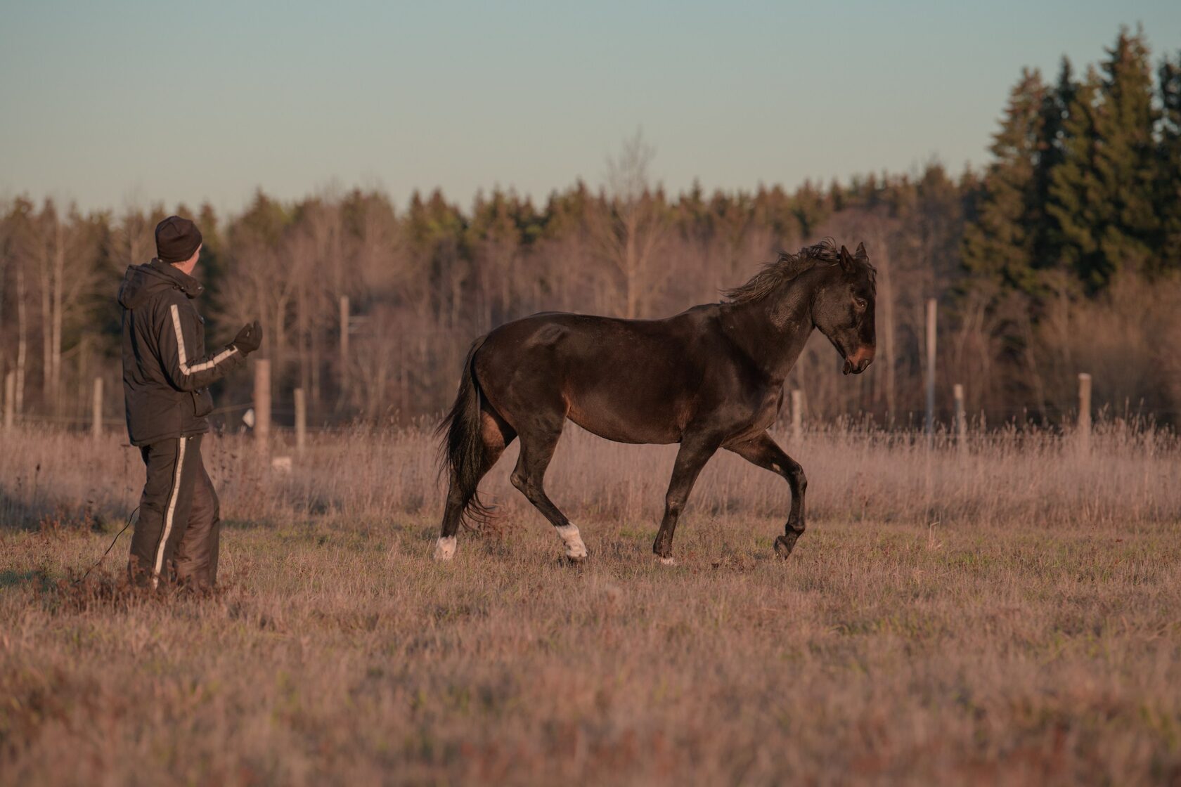 Развивая это упражнение, мы создаём виртуальную корду, когда лошадь двигается разными аллюрами вокруг человека, а он при этом остаётся практически в одной точке, но регулирует импульс и направления движения. Это прекрасный навык, которым должен обладать любой владелец лошади.Ведь он сталкивается с теми же задачами что и табунный жеребец – необходимость направлять лошадей в нужную сторону, иметь среди них авторитет и право принимать решения.